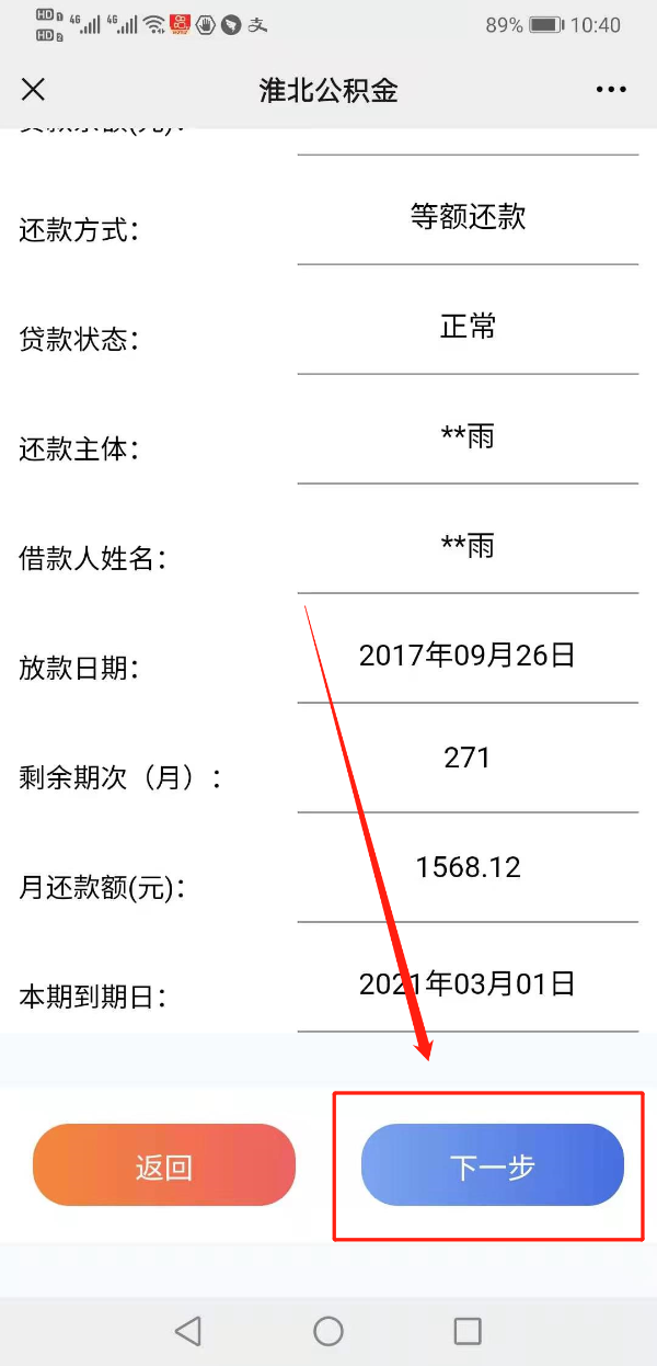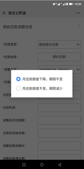 ②当选择还款类型为“提前部分还款”时,选择“调整方式”填写“还款金额”,系统会自动计算还款信息,确认后点击下一步;