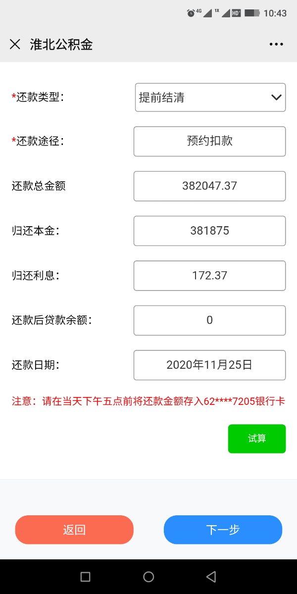 ①当选择还款类型为“提前结清”时,点击试算,此页面中反显还款信息,点击下一步;