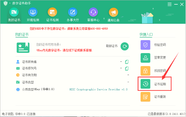 第二步,打开证书助手,点击右下角“证书延期”,按提示输入CA密码后即可完成证书的延期事宜(见下图),如有问题可咨询客服电话:4008804959。