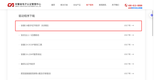 点击第一行“安徽CA数字证书助手(标准版)”右侧“点击下载”即可。