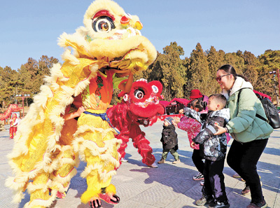 河南南阳卧龙岗文化园内,市民在欣赏舞狮表演。