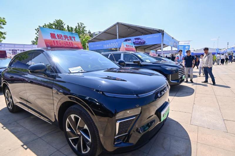 5月3日,消费者在山东省青州市举办的“汽车·房产家居文化节”上参观选购展出的汽车。2025年“五一”假期,全国消费市场繁荣活跃。新华社发(王继林摄)