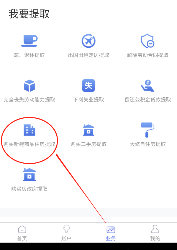第四步:登陆后,点击“业务”按钮,在“我要提取”类别中点击您所要班里的业务,以“购买新建商品住房提取”为例;