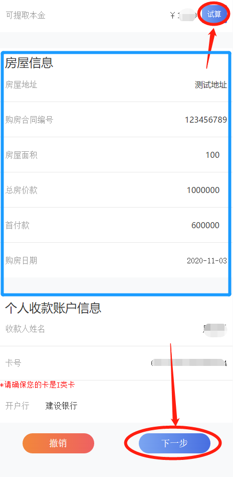 第五步:进入业务页面,输入您的房屋信息,点击“试算”,此时反显的个人收款卡号信息确认无误后,点击“下一步”;注意:个人收款账户信息如果没有显示任何银行卡,则是未能获取您有效的社保卡信息,您需要来厅办理此业务。