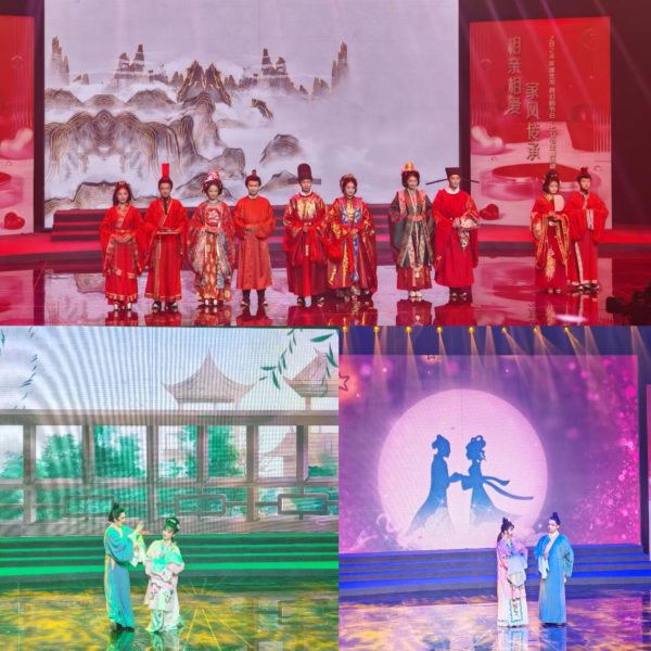 文化与浪漫融合,新风与传承相随。婚俗情景秀《穿越千年的爱恋》通过展示不同朝代的嫁娶习俗,礼赞七夕节传统节日、再现中华文化千年风采;黄梅戏《树上的鸟儿成双对》、花鼓戏《刘海砍樵》让观众于传统曲艺中感受美好爱意。