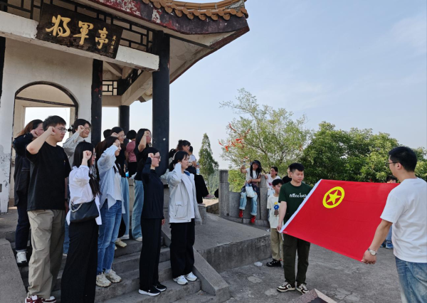 第三站登顶“相山之巅”,全体团员在“将军亭”下集合,团支部书记以“传承五四薪火,攀登青春之巅”为主题开展演讲,之后带领团员们面对团旗庄严宣誓,激励团员们以此为契机,牢牢记住身为团员的担当和使命,为新时代和谐社会发展贡献自己的青春力量。